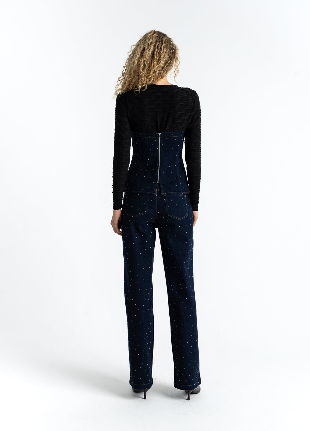 The model is 182 cm tall and wears size S. Her bust measures 82 cm, waist 61 cm, and hips 93 cm.